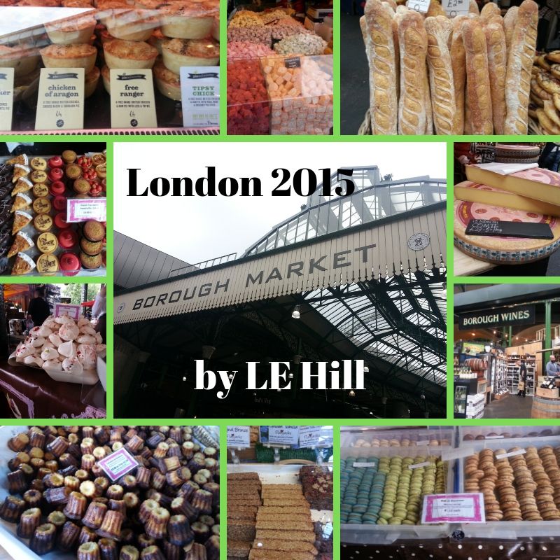 I love exploring London with my friends, those very lovely and patient souls, and one of my favorite places to visit is the Borough Market in Southwark. Every delectable edible is there, from a huge brownie tower (seen on my first visit) to a meringue cookie bigger than my hand (yum) to little meat pies called things like “Chicken of Aragon” and the “Free Ranger” that had me making Lord of the Rings connections. I made this collage after my visit in 2015, but here’s a bit from my 2009 trip scrapbook: