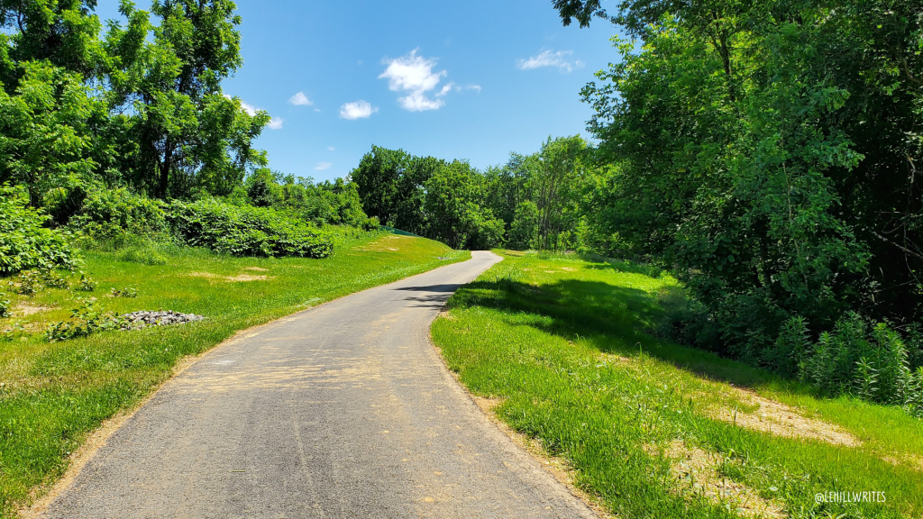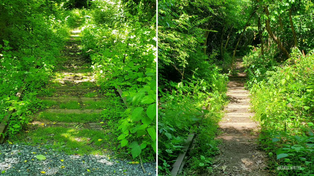 You cross over an old railroad track (where we met a couple walking the rails instead of the path) and there was even a pile of what looked like forgotten railroad ties along the way. We’ve been tempted to walk the rails to see where it comes out, but haven’t yet. Maybe when the weather is a bit cooler.