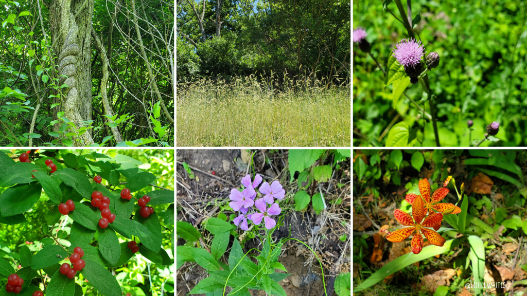 Along the way you hear and see birds of all kinds (we saw mostly robins) and squirrels dart across the path or rustle high in the trees. And different flowers and berries created bursts of color along the edges of the path, along with vine-twisted trees that gave much needed shade on the hot days.