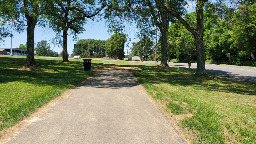 The path begins a slight but noticeable incline once you leave the shade of the trees. Ahead on the hill is a dog park beside Memorial Pool on Illick’s Mill Road. The path ends (or begins) just beyond the parking lot. If you start at this point, you can always park for free here.