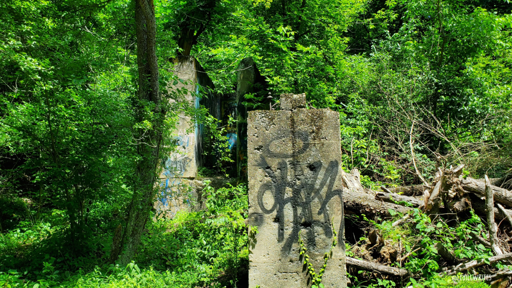 Odd cement structures poked out of the foliage, decorated with graffiti, and I wondered if they had been part of a building for the railroad once upon a time, but haven’t found anything about them yet online.