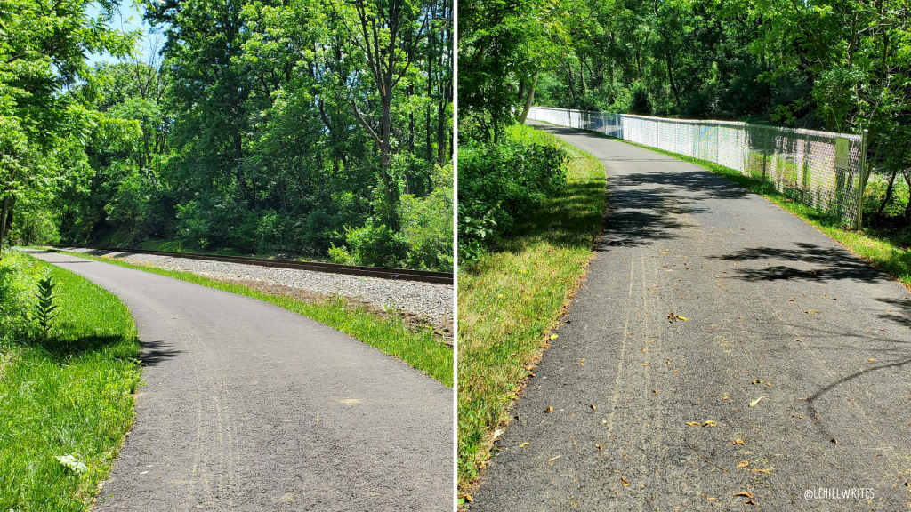 For the next half, you’re still following along Monocacy Creek, but the creek less visible, and the dirt trail has changed to pavement. You can see the active railroad track at various points in this section, more often than the creek. The first time we walked Monocacy Way the tracks were easily accessible in this section, but when we returned a few weeks later fencing had been installed.